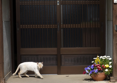 準家ネコのノラが、自宅訪問。はなは、ファミリーと思っているのか吠えずお構いなし。ヤギ達は、気になるのか2人でネコを見ながら固まっています。玄関で、チャイムは場所が高くて押せず、少し空いていた玄関戸から入れず、どうしようかと迷っていました。