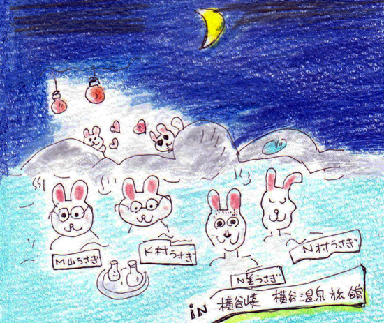 今回はうさぎイラストで、2012年太鼓集団志多らと、同行。宿泊先の長野県の温泉入浴イラストです。