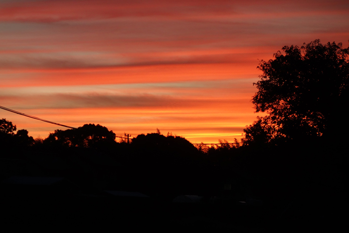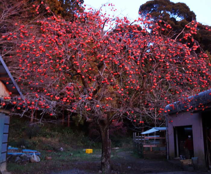 夕焼けが、朱に染まると、柿の実も朱に染まる。初冬に希に出現する空と柿の色です。