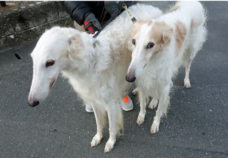 市内でたまたま散歩中の、ボルゾイに遭遇しました。紳士である飼い主さんが気持ちよく対応してくれました。ボルゾイはロシア原産の大型犬の猟犬で、2頭はゆったりした歩きで、風格を感じます。