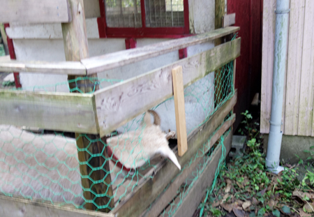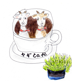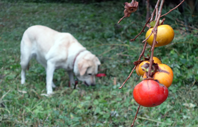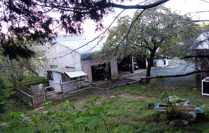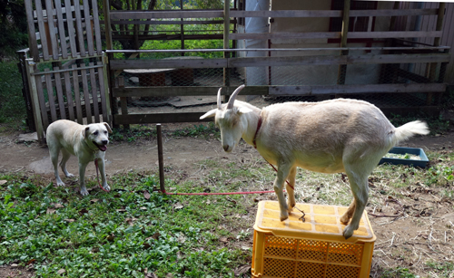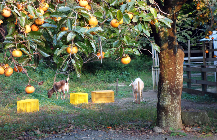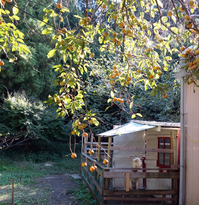 ヤギ本を読んでいると、里山でヤギを飼うと、サルはヤギを嫌い、近寄らないとの研究があります。そうであると嬉しい。柿とヤギ舎の位置関係は写真のようで、山側からサル目線で撮っています。周囲は、ヤギ糞だらけ。ヤギ臭も放っています。メイもお立ち台に登り、睨みをきかせています。