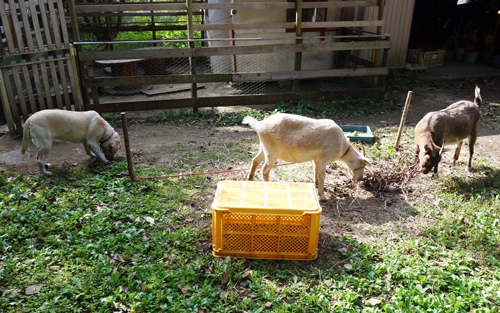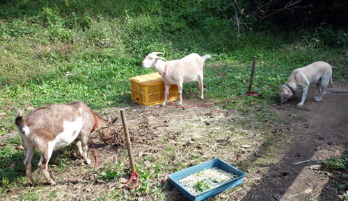 ヤギ飼いになってよく聞かれるのは、雑草食べてくれていいノン(三河弁)と言われますが、半分はその通りです。半分はヤギ餌確保に忙しくトータルでは忙しくなっています。主食は、農協購入の、飼料チモシーですが、それだけでは飽きるし、エンゲル係数も高くなるので、残りは、放牧と飼料調達の日々です。