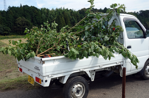 大好物の桑の葉収穫です。マイ田んぼの畔に自生した桑の枝を飼って餌に。大量収穫には軽トラ大活躍。田舎暮らしは、軽トラは、オールラウンドカーです。