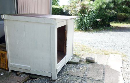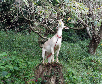 ヤギ本を読んでいると、里山でヤギを飼うと、サルはヤギを嫌い、近寄らないとの研究があります。そうであると嬉しい。柿とヤギ舎の位置関係は写真のようで、山側からサル目線で撮っています。周囲は、ヤギ糞だらけ。ヤギ臭も放っています。メイもお立ち台に登り、睨みをきかせています。