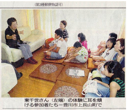 「海軍工廠空襲 体験語る 豊川の東さん子どもらに」と見出しがついて掲載されました。配偶者の短歌仲間の東千世さん(87歳)を自宅に招いて、地元のこどもらに、空襲時の様子を話しました。