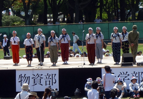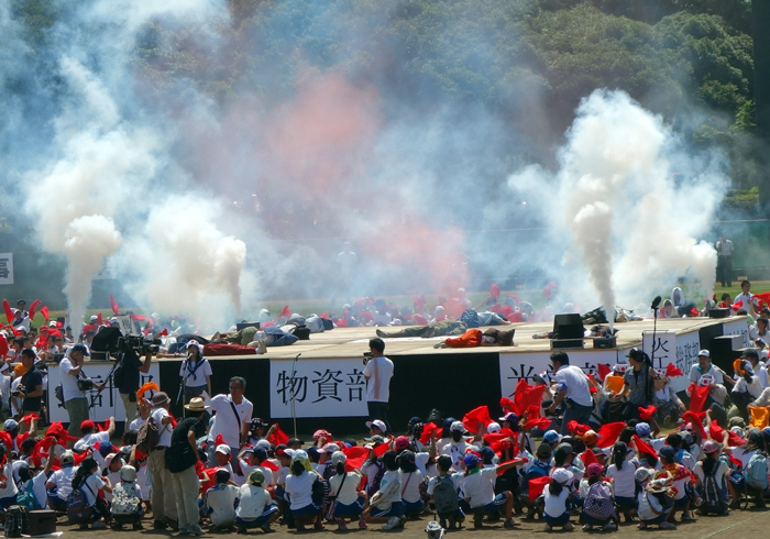 写真は、実行委員会企画による 小中高校生参加の再現劇写真のです。会場内では、倒れた男性を現認し、会場内の子ども達も体調不良で、一人ひとり先生に付き添われて、救護所に行く子ども多し。長時間の暑いグランド内での待機は見ていて辛かった。再現劇は素晴らしかった。でも、グランドは暑かった。