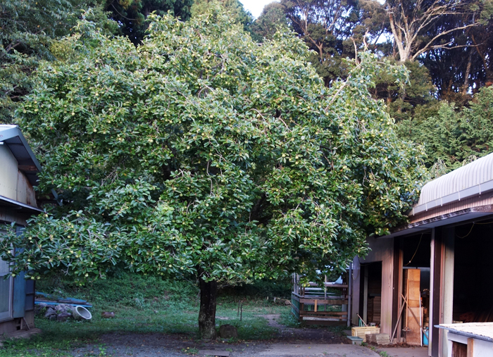 もう亡くなった、大正15年生まれの父に 生前 いつごろ植えたか聞いたら、わしが子どもの頃も同じ大きさだったとのこと。樹齢〇百年? 長年見ていて、樹勢が弱った時もあり、実のなり方は、年によって様々です。シンボルツリーとして、日差しよけとして大切な樹です。