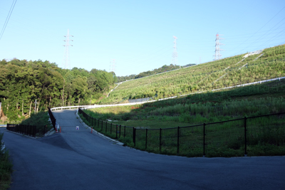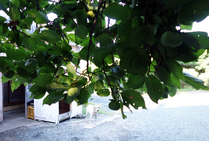 幹回り120cm 樹は上への成長が止ったら、横に枝を伸ばし、今は、枝は下に垂れ、青い柿が鈴なり状態です。歩くと、実とぶっかるのでよけて通ります。