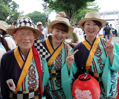 コンコン豊川は、平成11年発足の地元チーム。さまざまなイベントに参加して、豊川をPRしています。写真の愛称、オカジーは93歳 耳は少し不自由ですが、よさこいは現役です。いい生き方だと感じます。