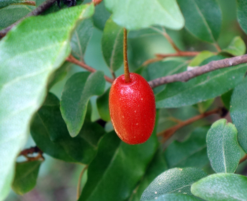 グミは柔らかな枝の低木性の木で、この時期実を着けます。実は、小指の先端関節ほどの大きさ。甘みと、酸味と、渋みがありますが、特に渋みが強く、食べると舌の先に渋みが残ります。
