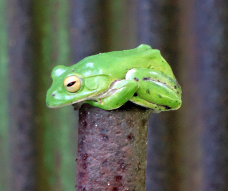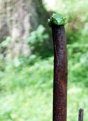 どうも、家に居ついているようで、6月の梅雨どきの夜 のそりのそりと家庭訪問に訪れます。はなが吠えてくれるので、懐中電灯とちり取り持参で水のある水道栓の所へ行き、居るとちり取りに入れて、山へ返します。ムカデはたたき潰すのですが、カエルはどうもそれが出来なく毎年の行事となっています。