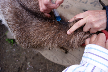 投与は、皮膚塗布 塗布量をセットし、背筋へ。私、ヤギの固定係 配偶者塗布係、メイたち少し抵抗していたが無事終了。配偶者は、以前新生児の採血にも従事していたので案外簡単かも? 無事終了。刺激を受けたせいか、メイ 即 糞ボロボロでした。