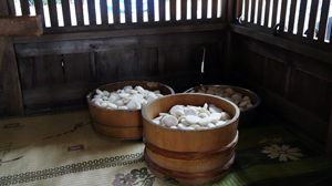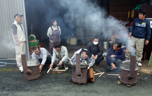 ③しめ縄作り、酒番 神社に張るしめ縄を手作りし、様々な作業をしている人に日本酒う注いでまわります。