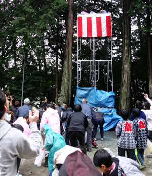 分配は、参加者による均等割り。年長者が多くということはありません。また、祭礼のお楽しみの、餅投げも 最初に子ども餅投げタイムがあり、子どものみ参加で、餅と共にお菓子の小袋も投げます。