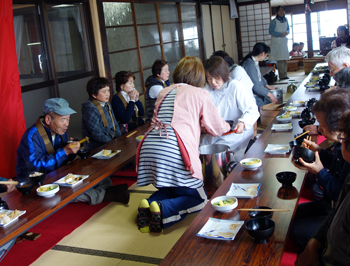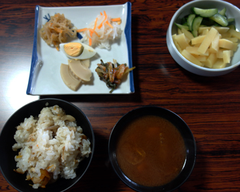 祈祷後の食事が楽しみ。一汁多菜 タケノコ入りご飯に、味噌汁、漬物と 手づくりのタケノコ煮やノビル和えなどが付きます。味噌汁が絶品 冠婚葬祭でふるまわれる、豆腐と油揚げの赤だし味噌汁は大量に作り、煮込むので渋みが増して、催しでなければ味わえない味で、おかわりしました。ソウルフードです。食事は、一粒残さず食べ、ご飯椀にお茶を注ぎ、沢庵で茶碗内の米粒をこそぎ完食です。