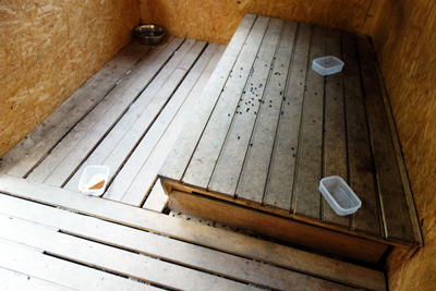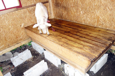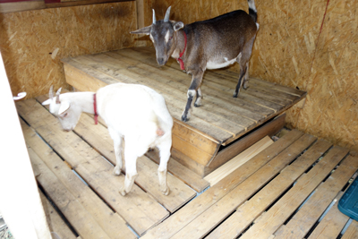 毎日朝夕 小屋内のフンは清掃していますが、時おり大掃除。床は、高床式すのこです。木材すのこは、湿気がたまらないように風の流れをつくり、木は水けを吸収し、発散させ湿気の苦手なヤギさんにとって快適環境です。住宅で言えば木造住宅。
