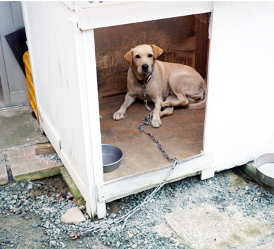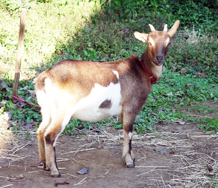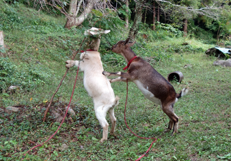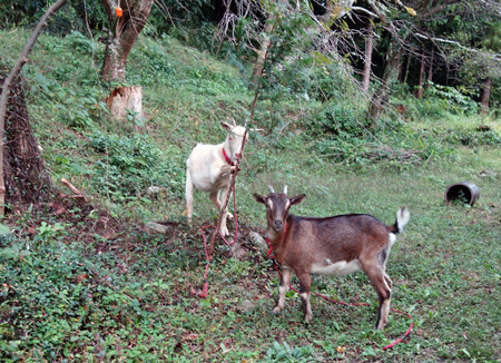 メンテナンスも必要です。下に落ちたヤギフンの回収、ありがたいことに乾燥して無臭です。そして、床を水洗いし乾燥します。2人は外に繋がれ見守っています。