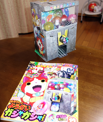 木曜日の夕食後 配偶者が頑張らなくちゃと、別室に閉じこもって、クラフト作業中。雑誌幼稚園の付録 ようかいガシャガシャマシーンの製作です。難しいわネー ボケ防止にいいかもと取り組んでいました。完成品を、これ見てと披露してくれました。