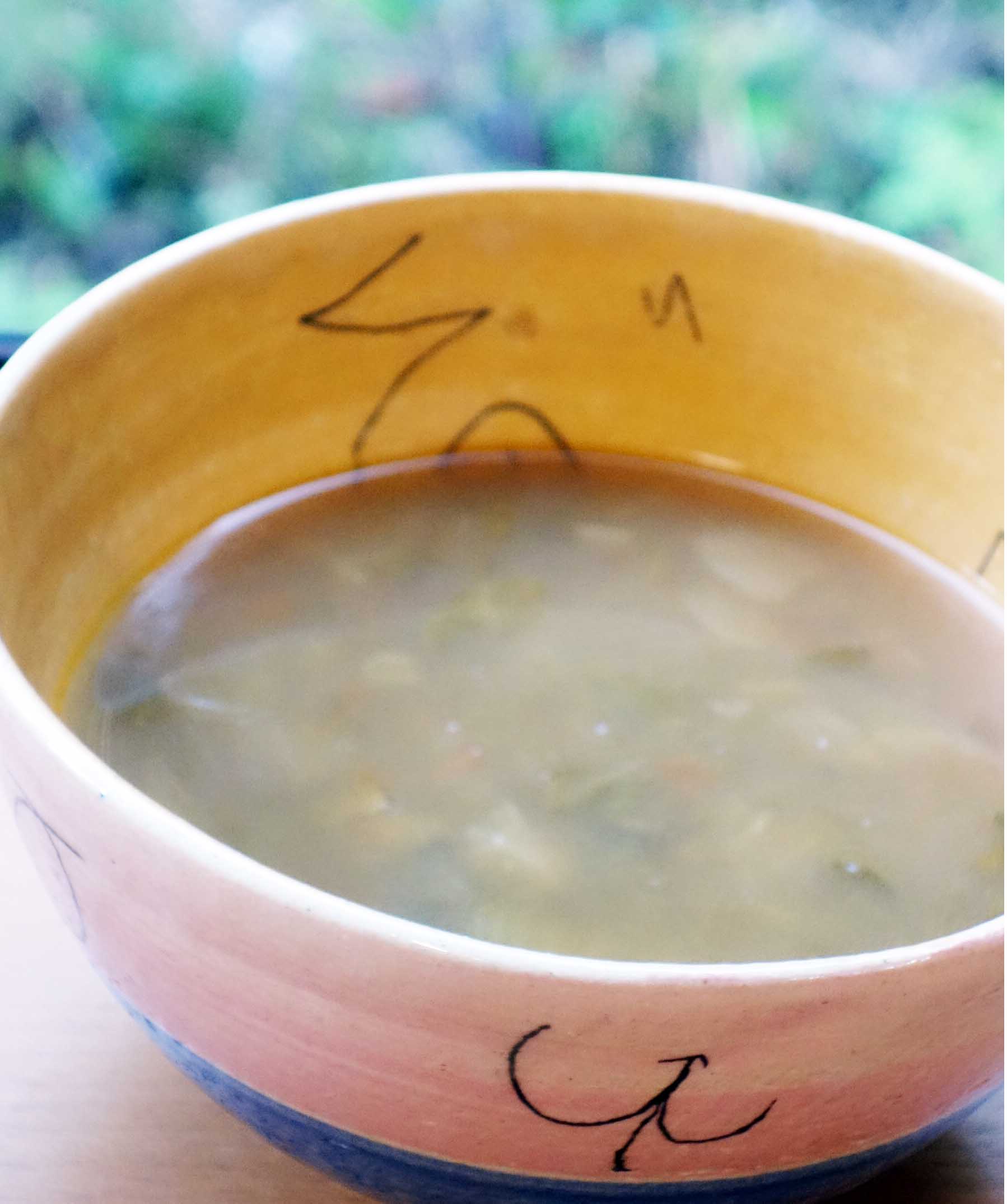 毎朝の食事には、野菜スープがあり。多くの野菜を入れた野菜に、無二の市出店の「山のハム工房ゴーバル」さん(岐阜県恵那市)のベーコン。大きな鍋に大量に作り、毎日火を入れて食しています。日が増し煮るほどに、野菜たちは甘くなり、そしてこのベーコンがなければ、この味はできないと思います。煮るほどに美味しくなります。味の支えはベーコンです。ベーコンは日々、味が力強くなってきます。