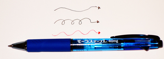 このペンは奇妙なことに、3本のノック式ですが、赤色ペンが1本と、黒色ペンが2本装填されています。芯だけでなく、ノックする部分の色も2つとも黒ですのでオリジナル製品か、何故? 想像ですが、医療関係者向けですので、書いている時に、突然インク切れや、カスレ字になったら困るのでバックアップ用に2本かと感じました。また、2色で十分という思想も。