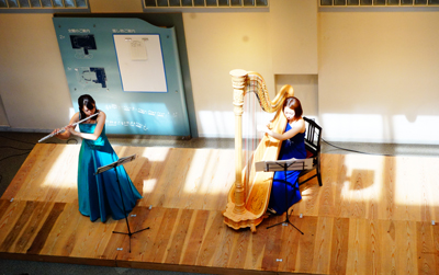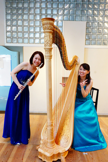 演奏は、佐々木遥香さん(ハープ)坂本実奈美さん(フルート)お二人は、愛知県立芸術大学音楽部卒業の新進気鋭の演奏家です。ハープは、誰も知っている楽器で形を見れば、皆ハープと認識します。しかし交響曲演奏や、テレビでは見ても目の前に、生ハープを見るのは私も初めて。興味しんしん。やはり大きい、マイカーで運んできました。弦も太い。そして、音はやさしく広がり、会場を包み込むような存在感を感じました。フルートの音色と絶妙の調和をしていました。