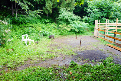 雨に濡れた緑が美しい。小屋の横に、リードをつけて放すスペースがあるが、雑草が繁っていたが草を食べつくし土が見えている。ここに、夏つばきが2本 なつめが1本 アーモンドの木が1本植わっていた。放すにあたって、木があるとリードを木に巻き付けて窒息する危険があるので、残念だが、撤収した。