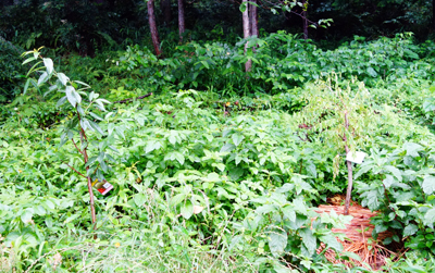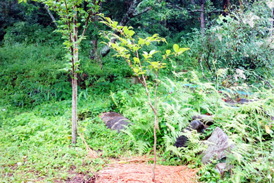 大きく成長した夏つばき1本は可愛そうだが伐採。他の3本は周辺へ移植。春に植えたばかりのアーモンドの木は、変わらず緑が深い。幹が太くなったなつめの木は、根付くかどうかまだ不明。2本植えた夏つばきの1本は、植えた場所の土が瓦礫混じりのせいか成長が遅く、お隣の夏つばきと大きさに成長に差が出て気になっていた。今回ふかふかの土の所に移植したら、蕾がいきいきしてきた。