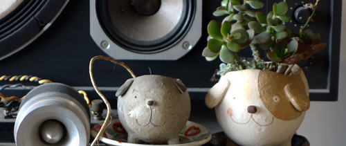 場所は、スピーカーの上で日当たり良好。時折水遣りをし、枝が日の射す方に向くので置く方向を変えるので、時にはお尻を向けることも。2匹は楽しそうに見守ってくれています。鶴田さんの作品は楽しい。