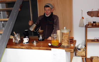 珈琲の寅さん、嬉しさと照れ笑い。うさぎささん 設楽手づくりのメープルシロップのお世話役 やさしい甘さです。
