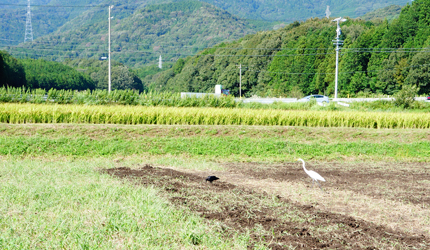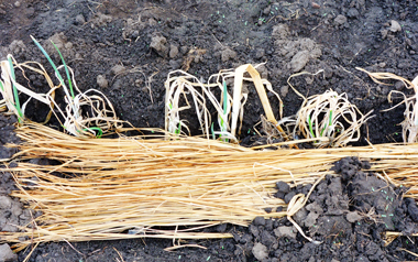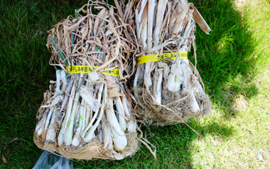 ネギの特徴は、二度植えです。夏に収穫できるまで栽培し、葉の部分を切り、干し苗にし、それを秋に、二度目の定植をします。これで、強い苗ができるそうです。一見すると枯れた苗のようですが、植えると葉が成長します。