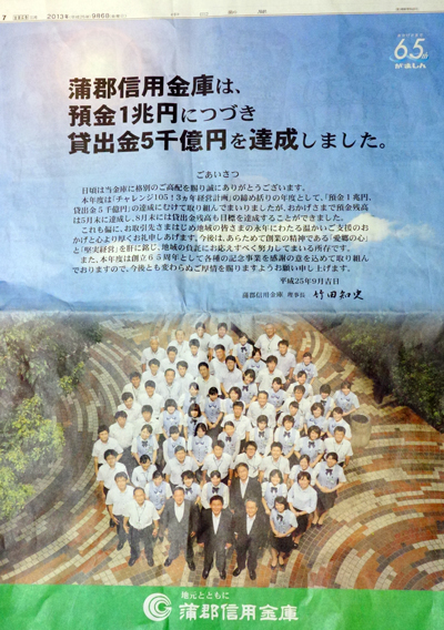 9月6日付け 中日新聞の蒲郡信用金庫の全面広告