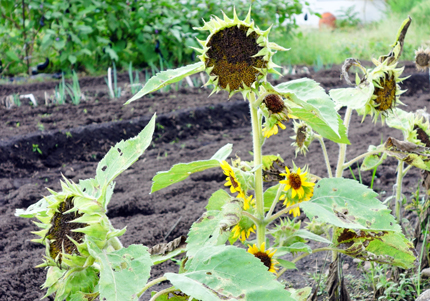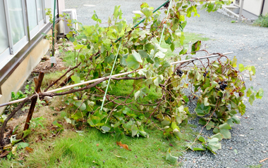 風雨が収まってからは、状況を見に外へ 野菜やブドウの樹が倒伏。