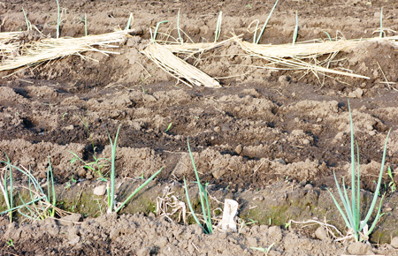 ネギは、茎の部分を土に被せ、白く長く育てる、長ネギと