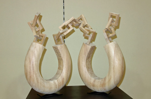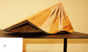 作品は、木を素材とした彫刻です。オブジェは、見る人の想像をかきたてる、メッセージ性の高いものです。