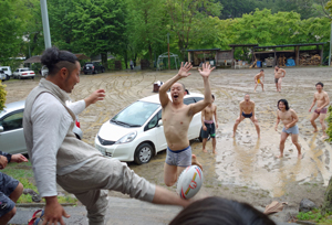 待ち受けるのは、泥グランドで待つチームメートたち、服を脱ぎ続々参加。