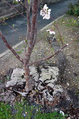 桜の古木の切り株から新芽がでて、花を咲かせました。