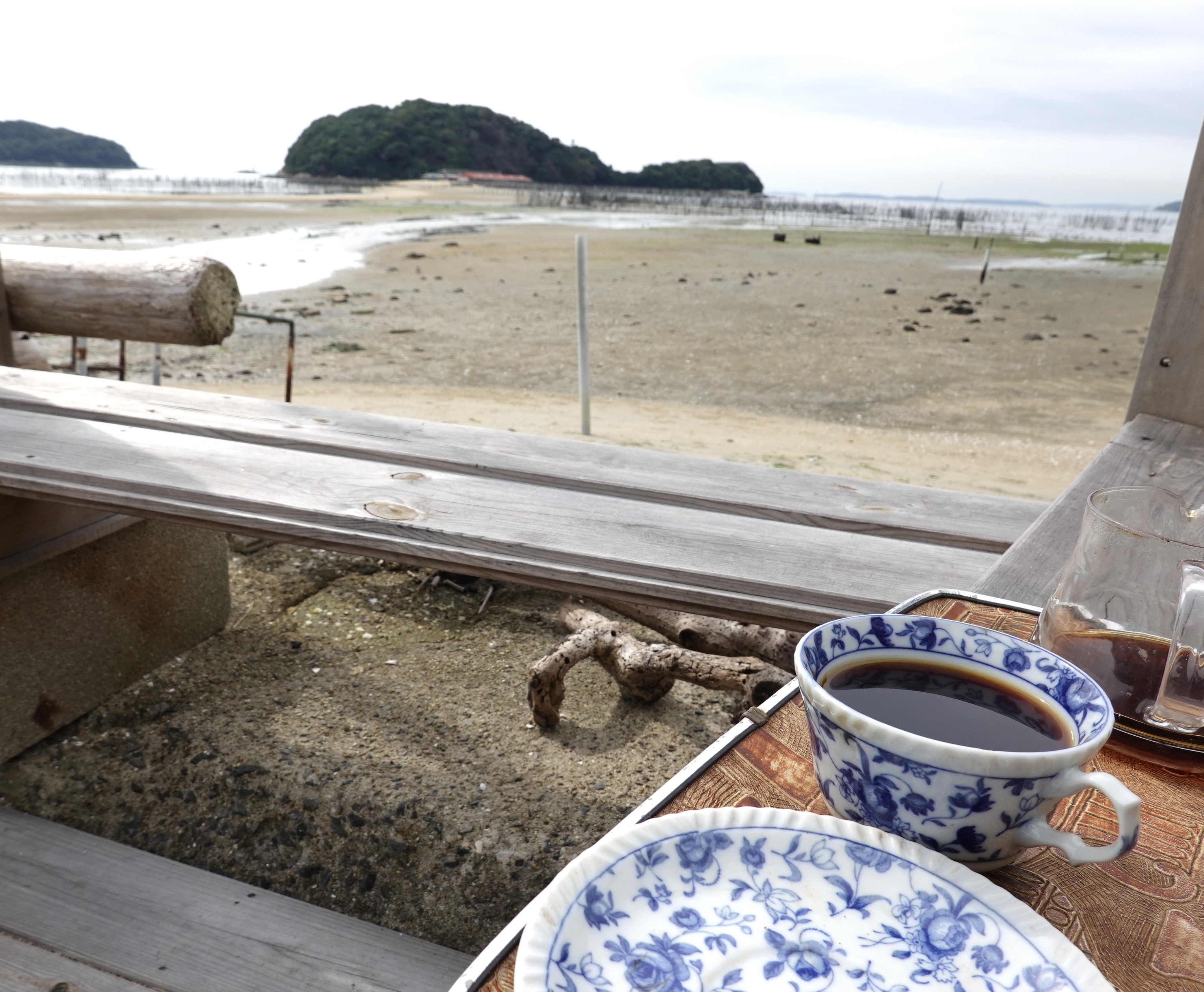 イベントスペースの前島市場で、トラさんのコーヒーを飲みながら互いに語り海を見ていた