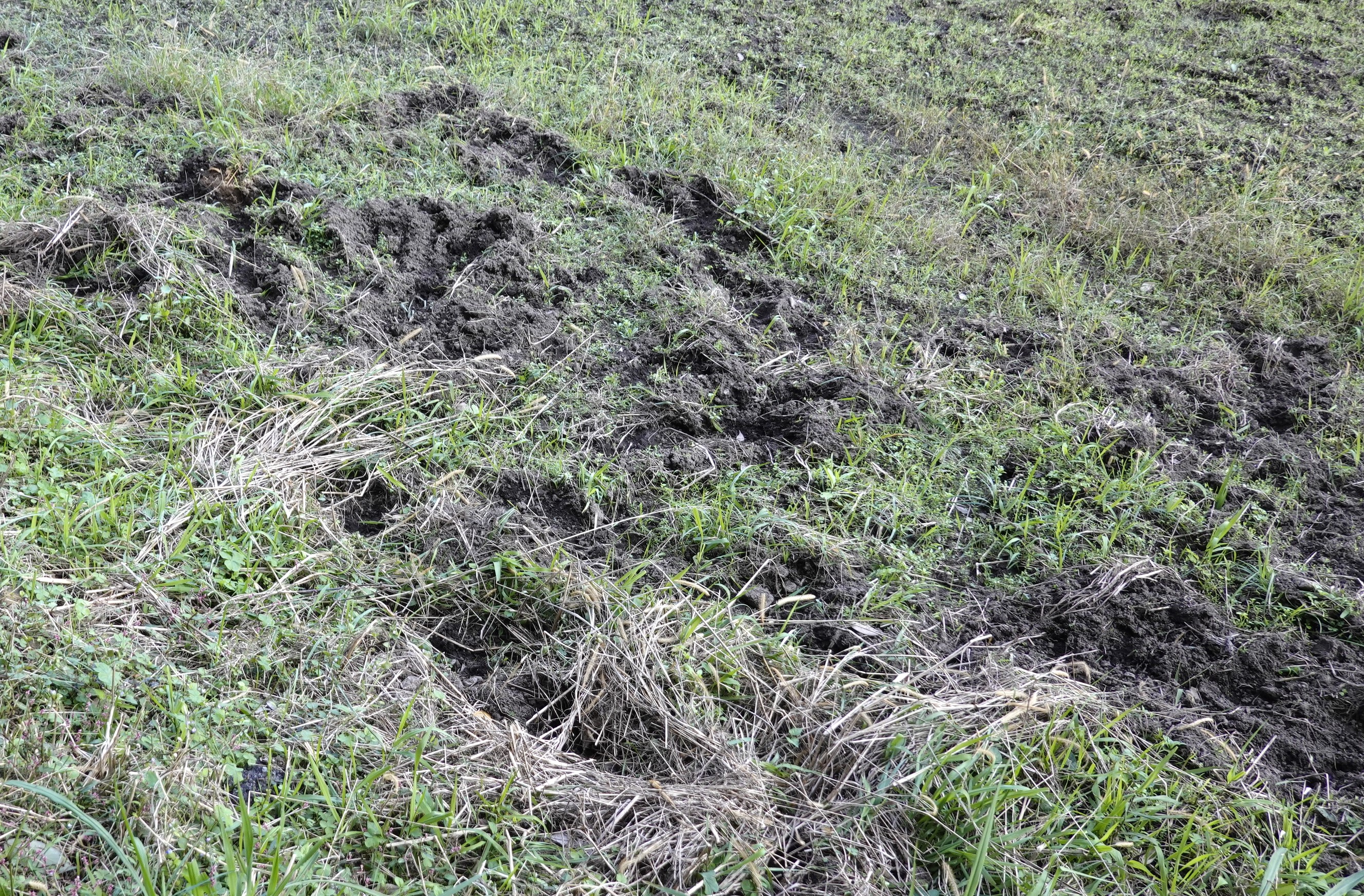散歩コースの里山 道路沿いの田の土をこねくり回したような、足跡 イノシシの侵入後です