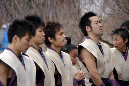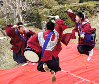 奉納は、雪をいだいた山々を背にして、たたき、奏で、舞いました。