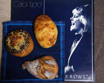 右側に自家製?パン 左側にサバの味噌煮、煮物などのお惣菜や焼きそば。