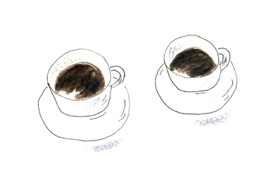 珈琲カップは白、そして、かおりたつ美味しい珈琲です。