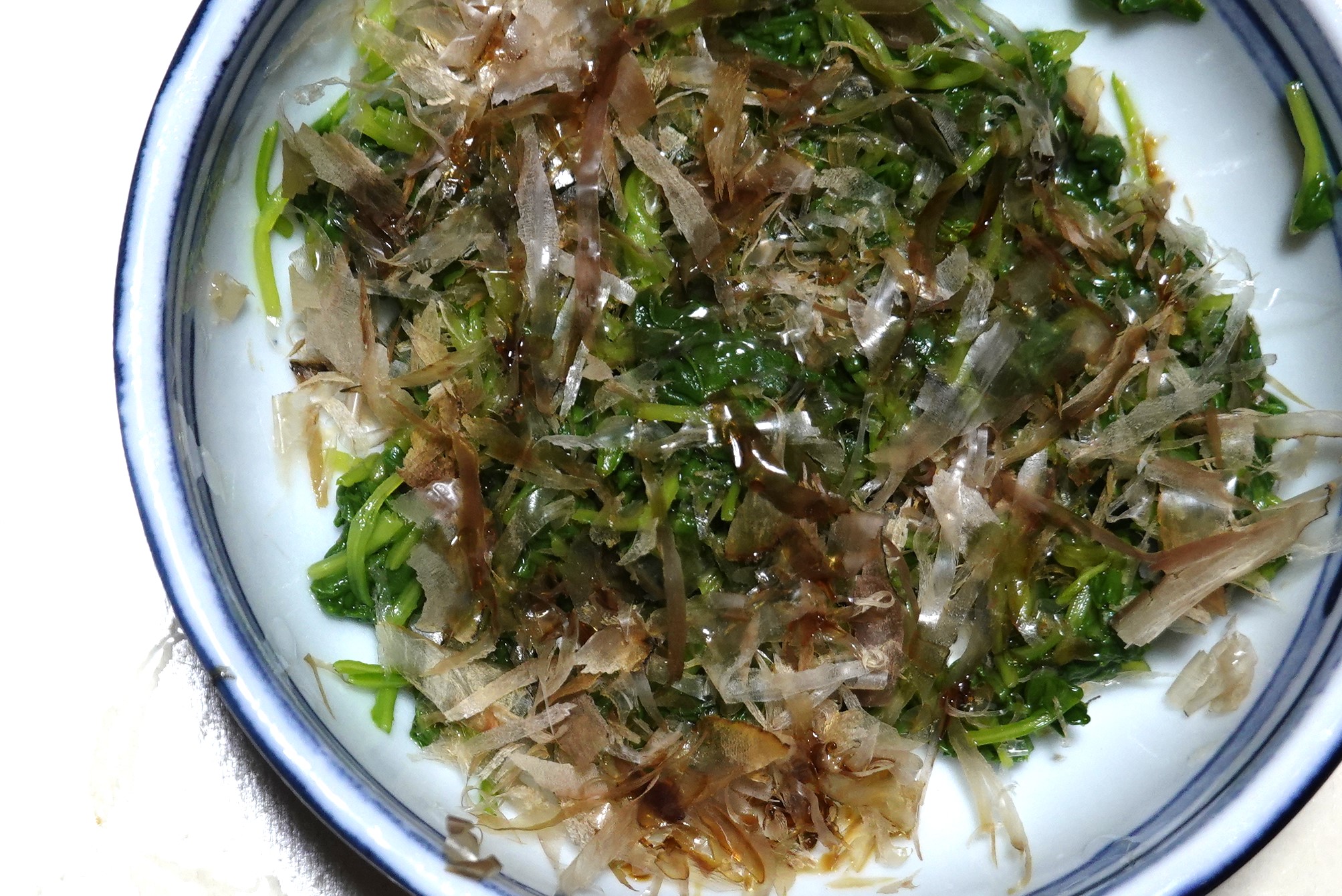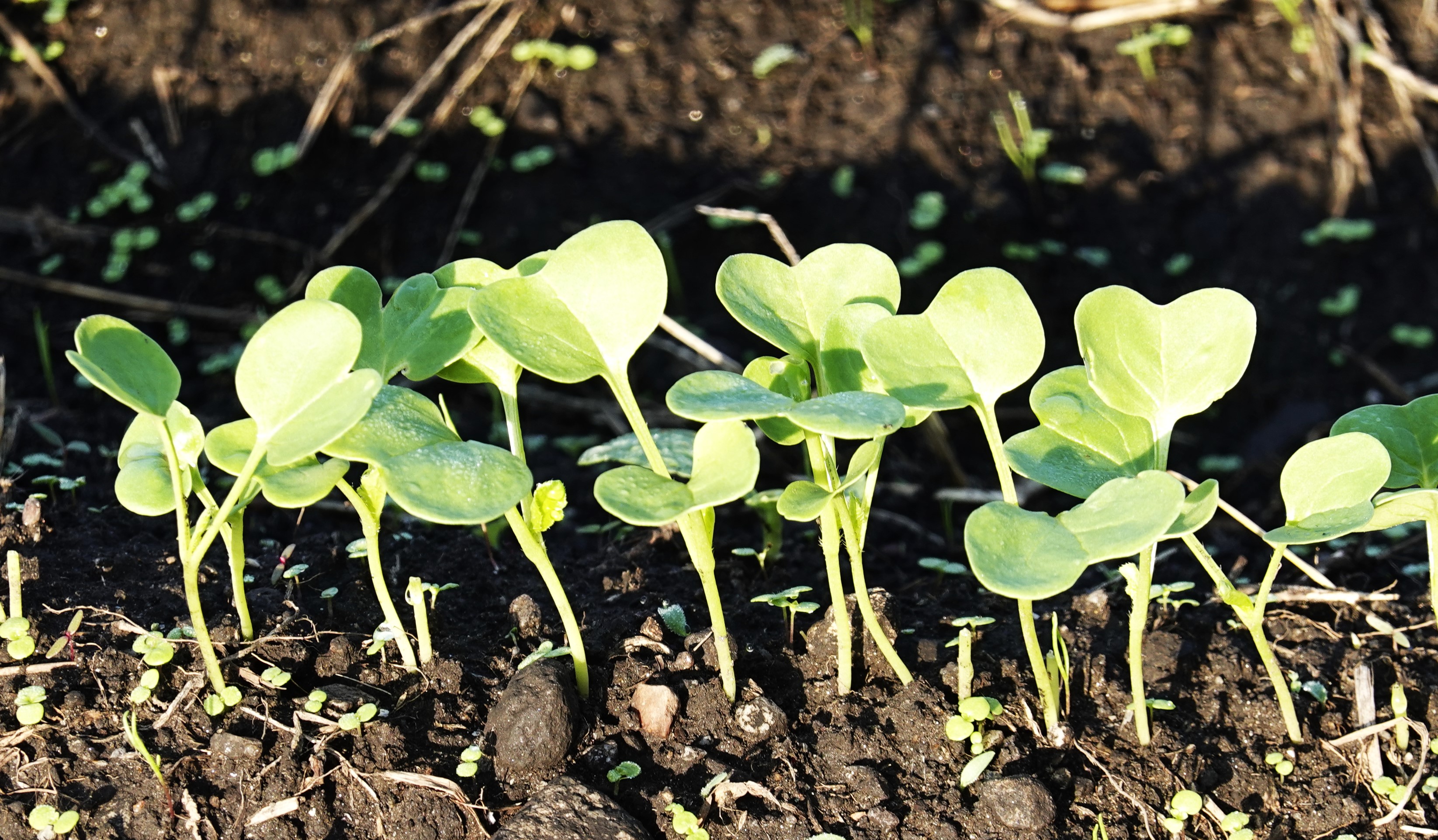 家庭菜園 種を蒔いた大根の葉が双葉になった 葉の摘み取りをし 手に一杯ほどの摘み取り葉