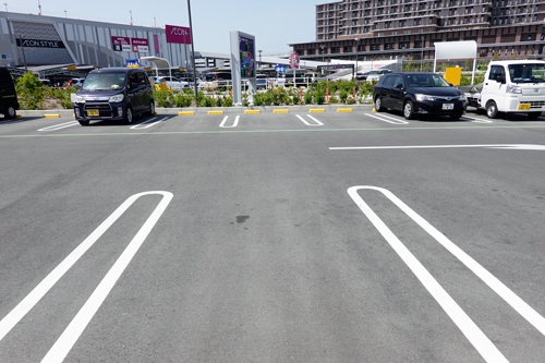 ありがたいのは、駐車線が二重線になっている駐車場 微妙に困るのが前方の駐車場との線が、少しだけずれているの 前の駐車場の線も目安にしているので
