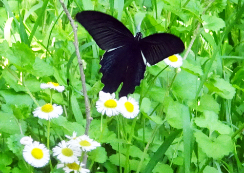 校庭は人で賑わい、シロツメ草も白い花が咲いています