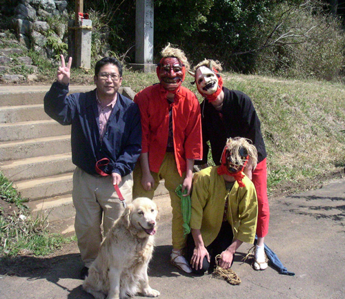 祭礼時 散歩中に神社鳥居前で鬼さん達と遭遇。記念写真をお願いし、ベッキー共々写真に。鬼はご近所の後輩たち、サービスたっぷり。ベッキーも怖がらずウエルカム。懐かしい。