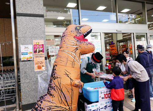 豊橋のSスーパーへ。普段でも混雑する人気スーパー。入口で、恐竜 ディノザウルスがお迎え。スーパーボールすくいのお手伝いシッポと足は長いが、手は短いので、あまり手伝いにならないが、人気者。