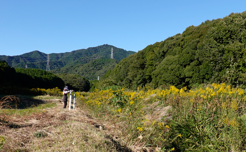 セイタカアワダチソウの黄色い花ばかり。左側は昨日刈り終えたばかり。 右側は 春に刈っても、秋はこの状態。どこでも繁殖し成長別格。茎は太い外来植物。1年放置すれば、回復困難。人で不足とはいえ、参った。