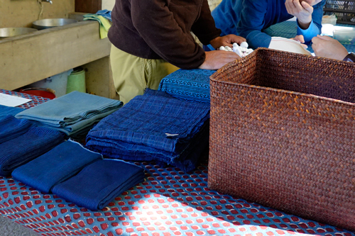 大きなイチョウの樹の下で、藍染めのワークショップ。木綿に絞りをいれ、藍に染めています。