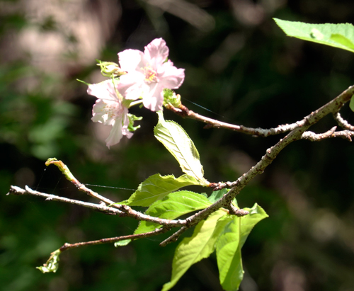 春でもないのに。葉が落ちて、芽生え新緑となった、庭の庭のクルミとサクラの樹