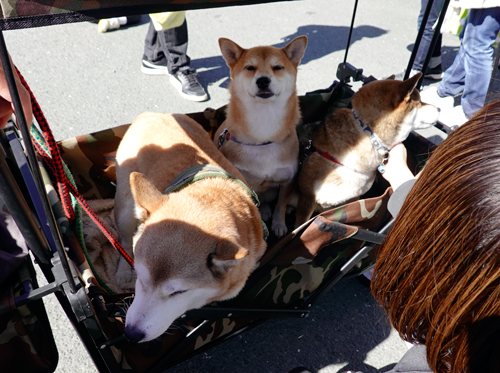 おじさん キャリーカーに柴犬 3頭静かにイベントを見ている。3頭は親子3代、純血種とは見ただけで解かる?。噛まないですか?ときいたら、トレーニングしてあるし、この子達は、人が好きなんだヨ。